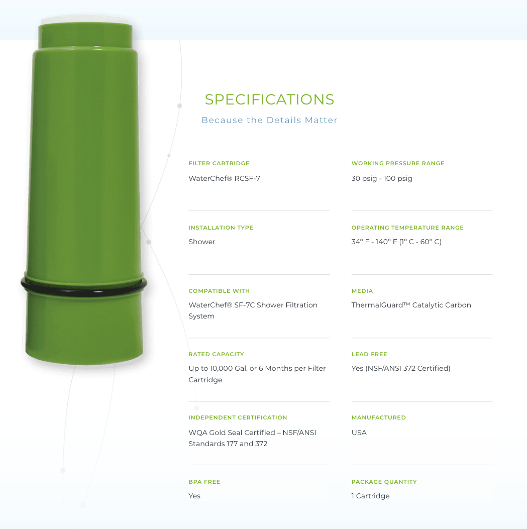WaterChef® Shower Filter Replacement Cartridges (RCSF-7) utilize advanced ThermalGuard™ catalytic carbon technology to substantially reduce your exposure to chlorine, leaving your body’s natural oils and proteins intact. This results in immediate cosmetic benefits including: softer and more manageable hair, healthier and smoother skin, and reduced eye irritation. Additionally, you may notice that you use less soap and conditioner, and if you use hair color products, you may also experience longer-lasting color between treatments.